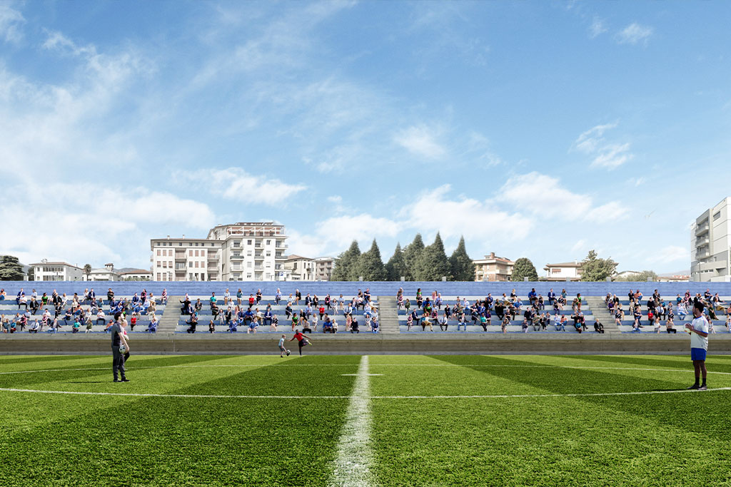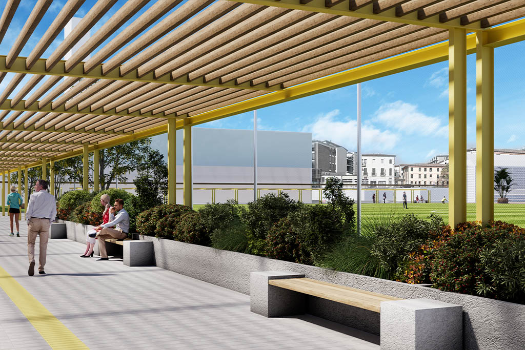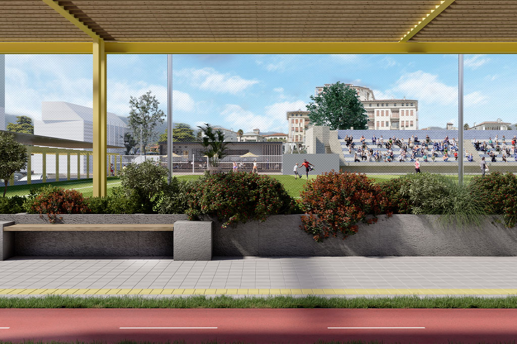 Il nuovo complesso include una palestra polifunzionale, campi da beach volley, laboratori modulabili, bar e foresteria. La palestra è concepita come spazio ibrido, capace di ospitare eventi sportivi, culturali o teatrali. Gli spazi esterni seguono il principio della “città aperta”: orti urbani, aree gioco, mostre temporanee e percorsi semi-coperti definiti da una pergola continua, simbolo identitario e collegamento tra i nodi del centro.
