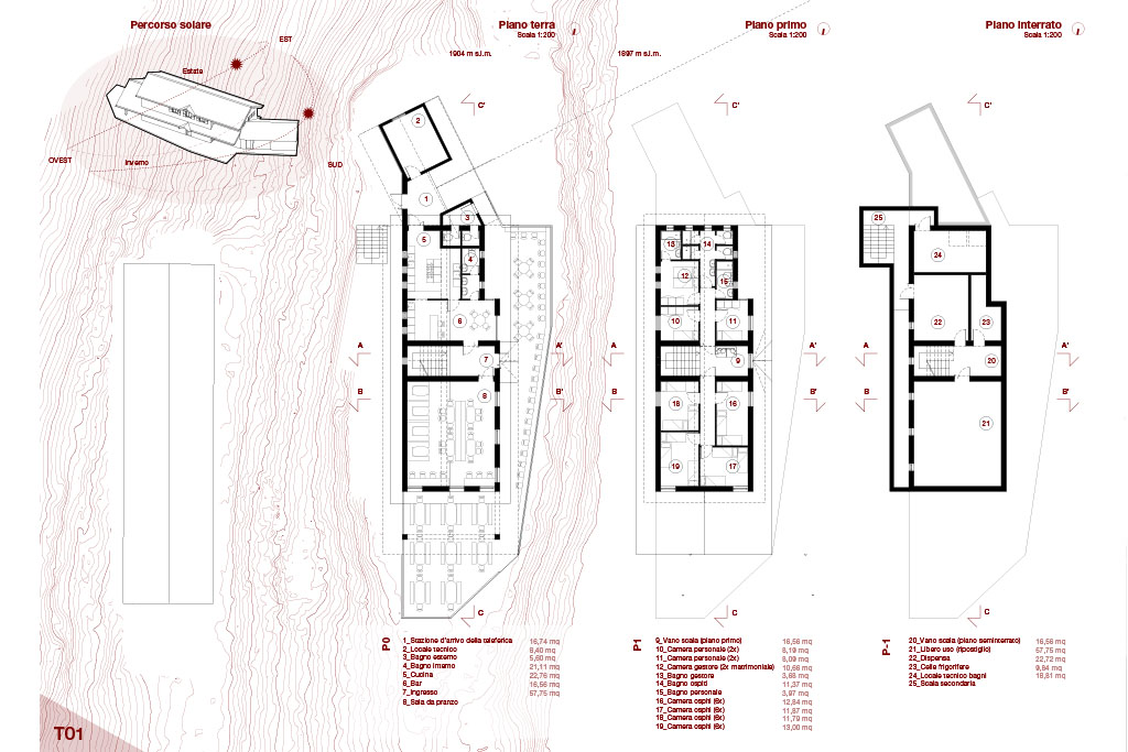Il primo piano sarà interamente destinato alla zona notte; il piano terreno ospiterà, invece, oltre alle strutture operative della teleferica e del locale tecnico, la cucina, la sala da pranzo di sessanta posti a sedere e un piccolo bar. All’esterno viene realizzato un grande terrazzo, in parte coperto, dove sono collocati numerosi posti a sedere di cui alcuni con seduta mobile rivolti verso la valle e il panorama. Una soluzione per godere appieno del luogo anche nei momenti di ricreazione.