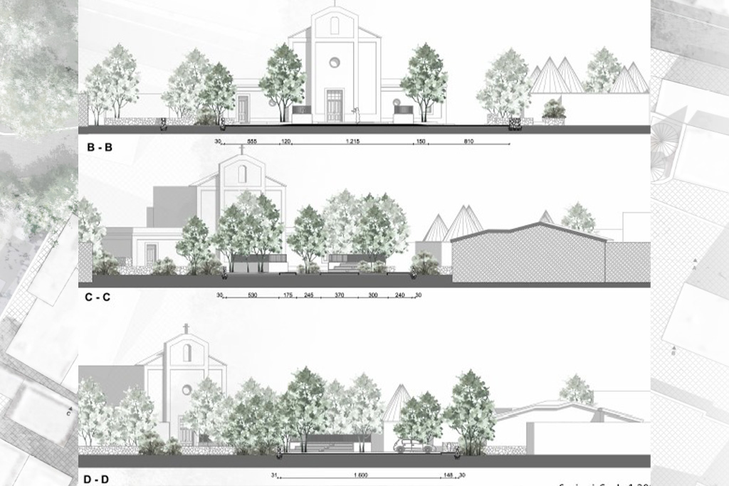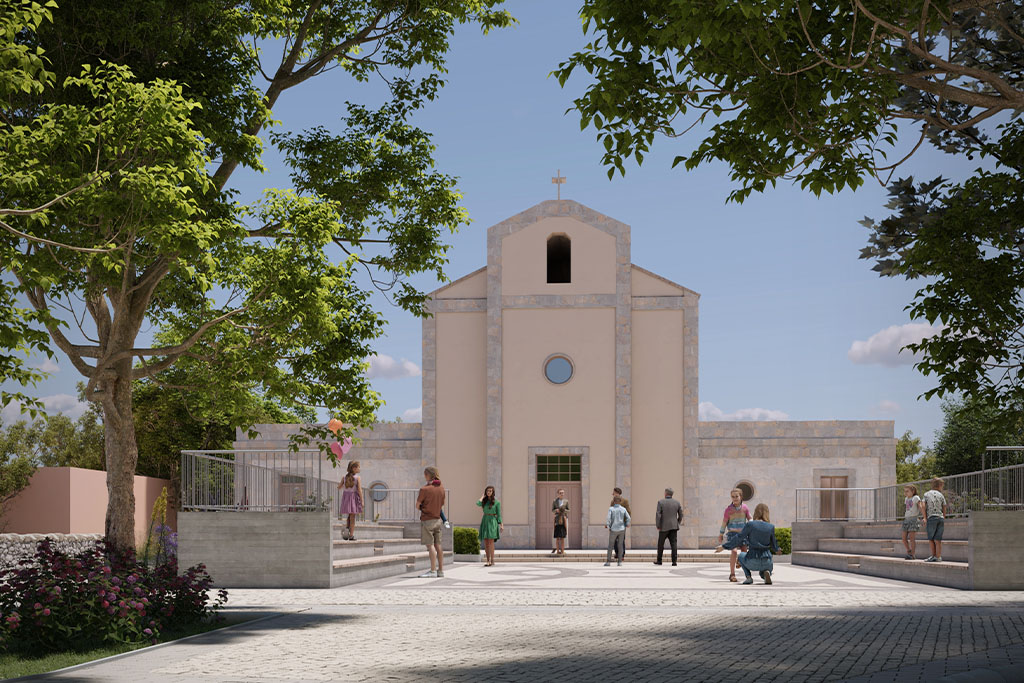 La piazza antistante la chiesa da asse viario di passaggio, evolve in uno spazio multifunzionale caratterizzato da ampie gradinate laterali a delimitare lo spazio verticalmente. Si prevede l’uso di pietra locale per realizzare una pavimentazione caratteristica e l’inserimento di alberature a limitazione dell’effetto isola di calore.