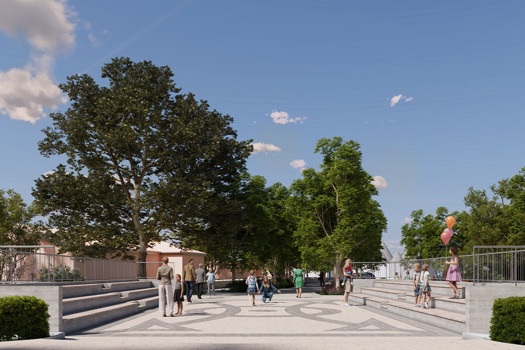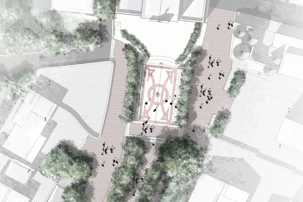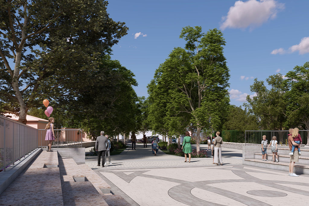 Lo spazio della nuova piazza è disegnato in modo chiaro e semplice: le gradinate laterali delimitano lo spazio verticalmente, mentre una pavimentazione decorata identifica il luogo in modo inconfondibile. Il decoro a pavimento è realizzato con l’uso di pietra locale (carparo e mazzaro) e marmo, sostenendo la bellezza del luogo, insieme all’inserimento di verde a mascheramento delle gradinate. Queste ultime possono contribuire al controllo della temperatura durante i mesi più caldi dell’anno limitando l’effetto di isola di calore per tutto il quartiere.
